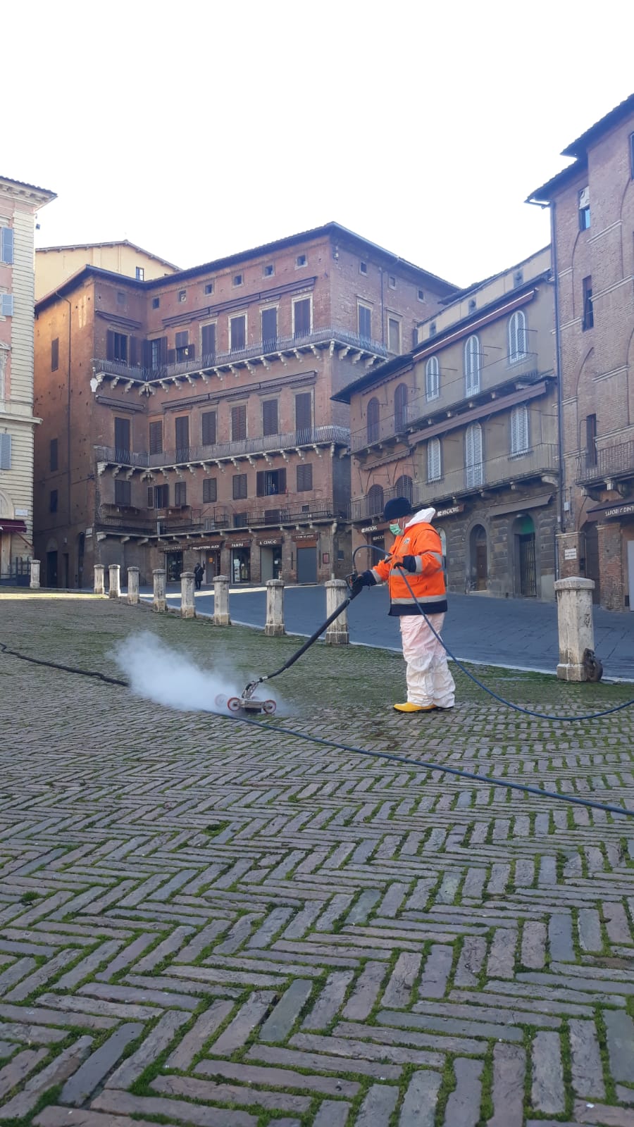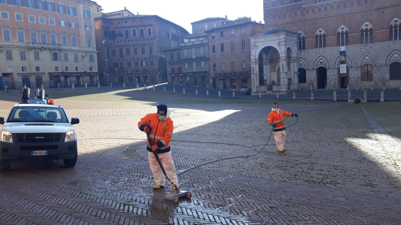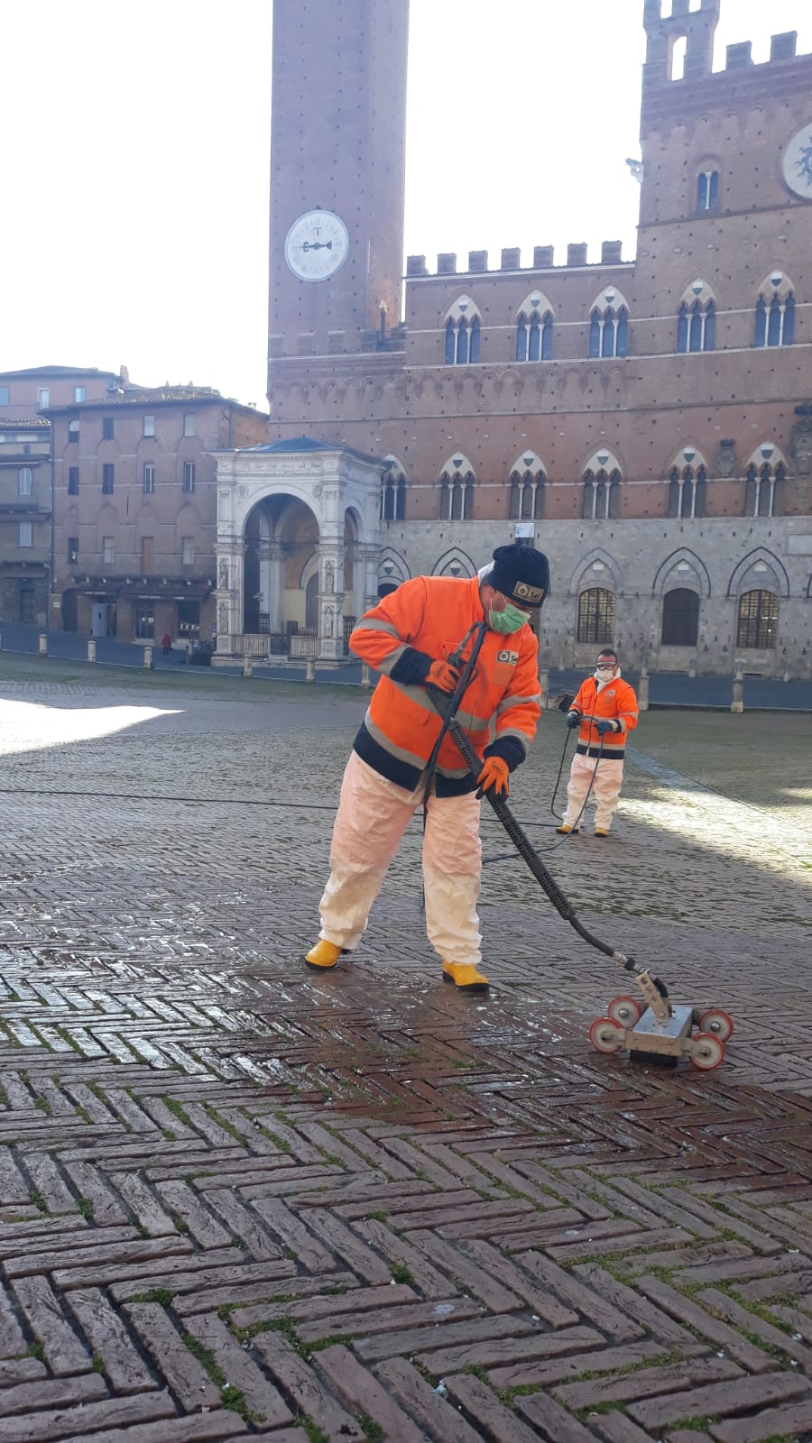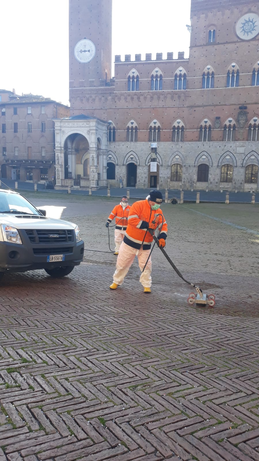 SIENA. Questa mattina si sono svolte le operazioni di sanificazione e igienizzazione in piazza del Campo a Siena. Il servizio, che vede l’utilizzo di un macchinario capace di emettere vapore a 140°, è svolto da Sei Toscana su richiesta dell’Amministrazione comunale e rientra fra gli interventi straordinari messi in campo per il contrasto della diffusione del Covid-19.