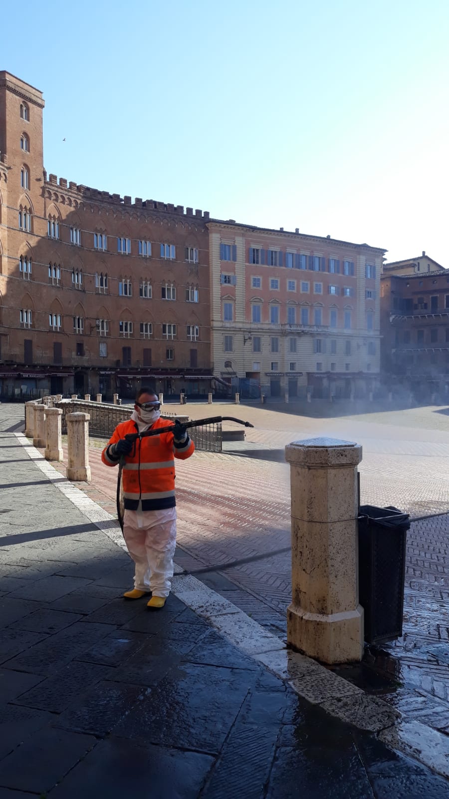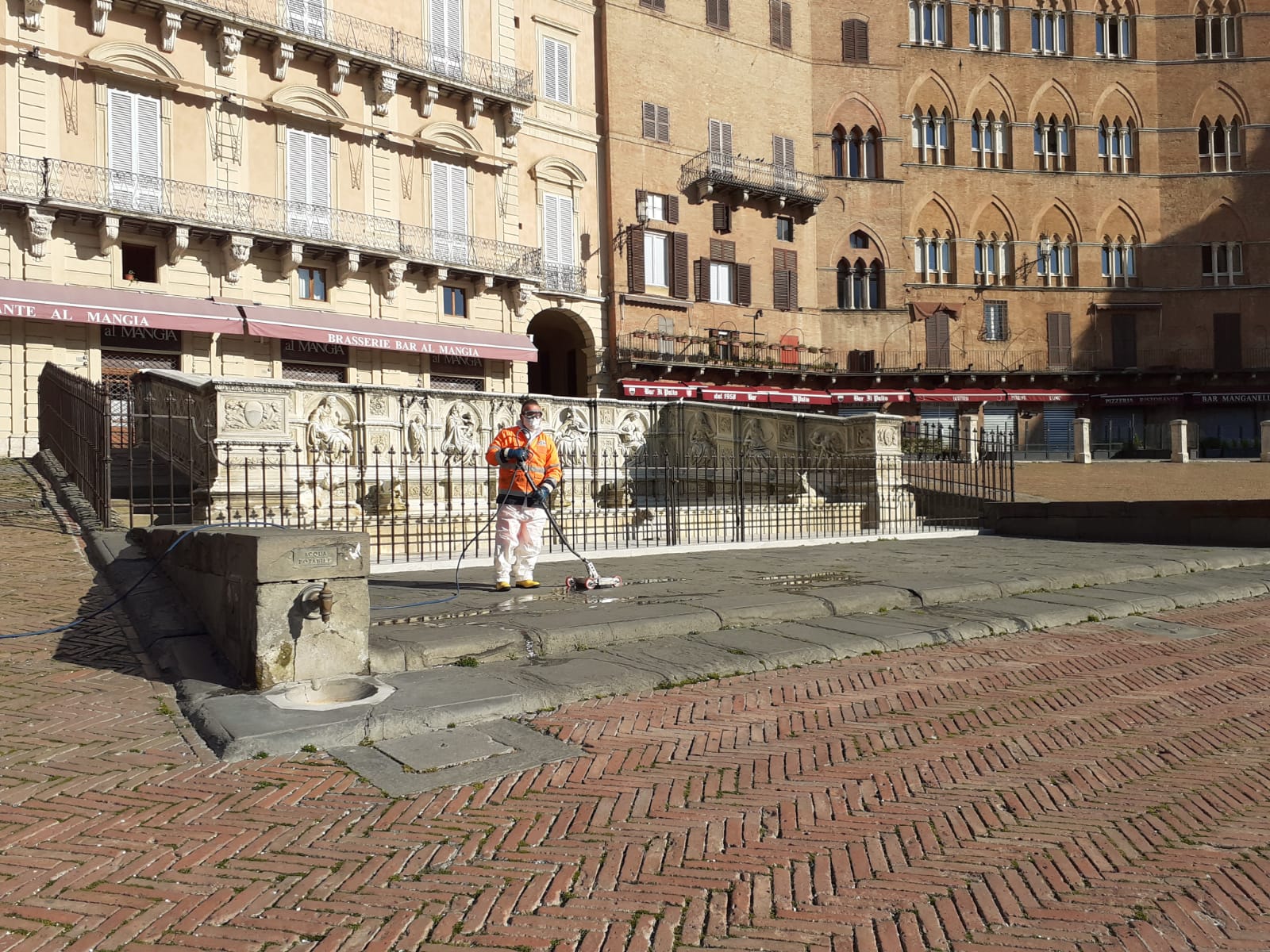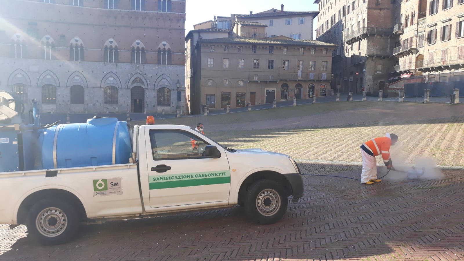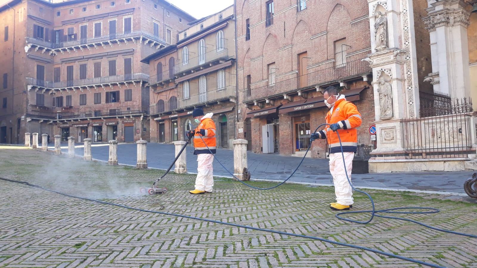 SIENA. Questa mattina si sono svolte le operazioni di sanificazione e igienizzazione in piazza del Campo a Siena. Il servizio, che vede l’utilizzo di un macchinario capace di emettere vapore a 140°, è svolto da Sei Toscana su richiesta dell’Amministrazione comunale e rientra fra gli interventi straordinari messi in campo per il contrasto della diffusione del Covid-19.