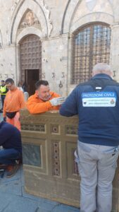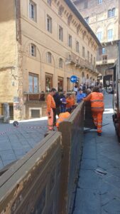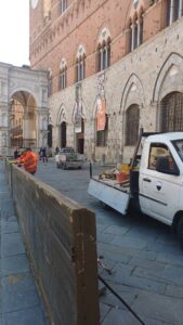 SIENA. Oggi in Piazza del Campo è in corso l’intervento di montaggio per l’esecuzione di rilievi e verifiche tecniche sui parapetti esistenti, a seguito dei lavori all’acquedotto.