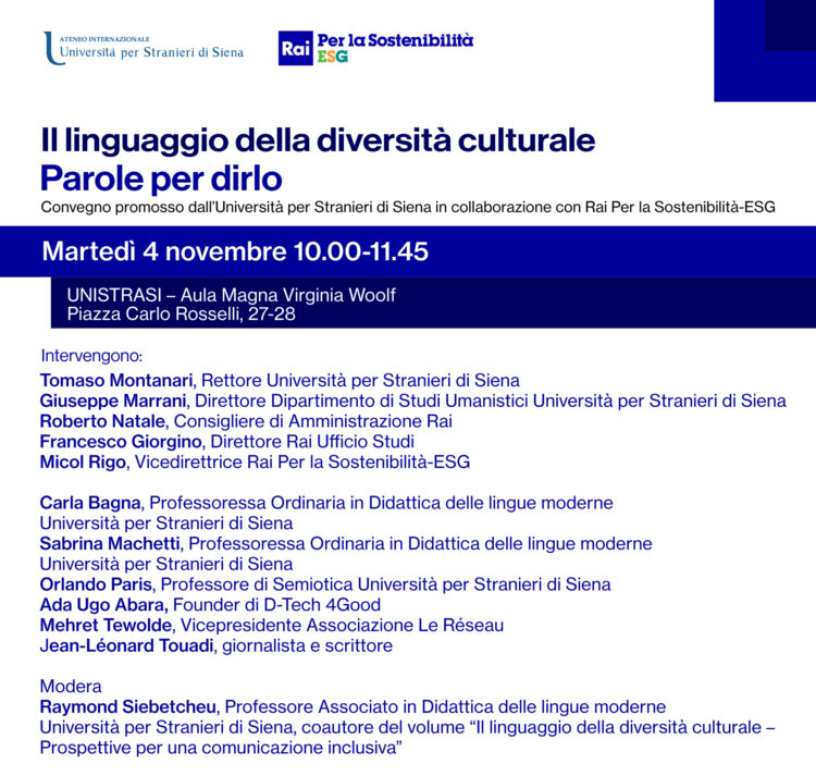 SIENA. Martedì 4 novembre 2025, alle ore 10, presso l’aula magna Virginia Woolf dell’Università per Stranieri di Siena, si terrà un convegno organizzato dall’ateneo in collaborazione con Rai Per La Sostenibilità-ESG. L’evento s’inserisce nell’ambito della presentazione del libro Il linguaggio della diversità culturale. Prospettive per una comunicazione inclusiva, curato da Rai Per la Sostenibilità-ESG con il supporto di Rai Ufficio Studi.