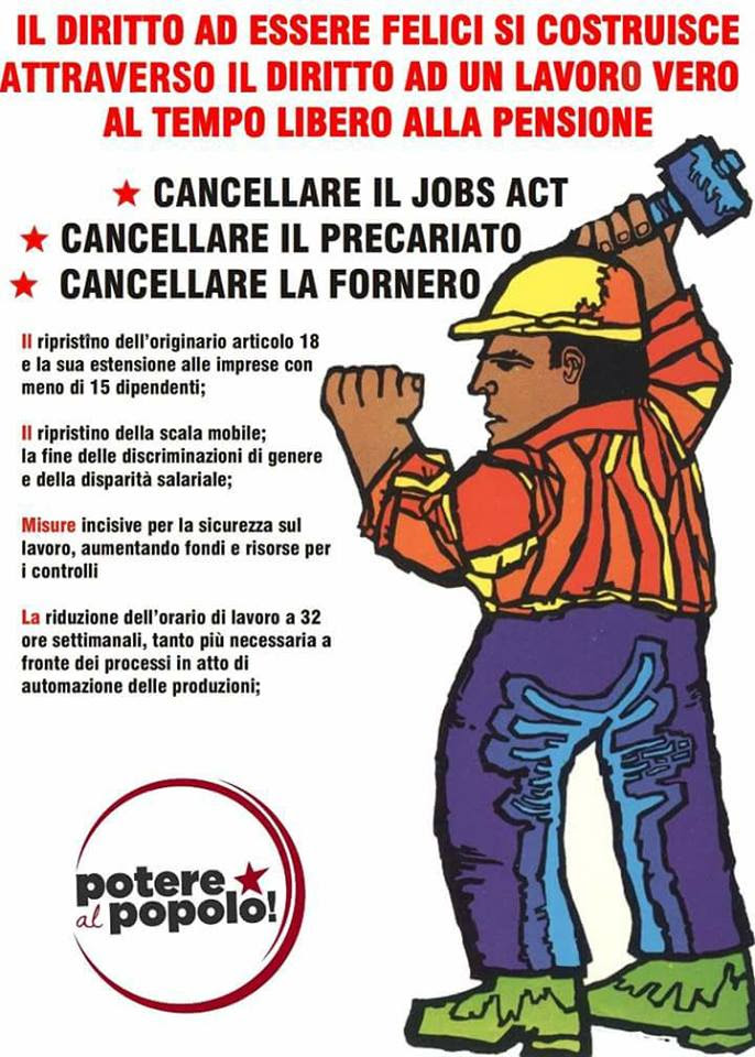 Potere al popolo! lotta per restituire salari e dignità ai lavoratori: per il ripristino dell’art. 18, esteso anche alle aziende con meno di 15 dipendenti, per la cancellazione del Jobs act, per mettere fuori legge qualsiasi tipo di lavoro gratuito, per la democrazia sui luoghi di lavoro e la libera scelta della rappresentanza sindacale, per la fine delle disparità di genere e disparità salariale, per misure di sicurezza sul lavoro, per la cancellazione della legge Fornero e per investimenti pubblici in politiche industriali e di riconversione ecologica dell’economia.