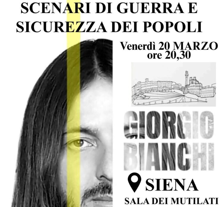 SIENA. sulla crisi antropologica dell’Occidente Siena, 20 marzo – Il giornalista e fotoreporter di guerra Giorgio Bianchi è stato protagonista della conferenza “Scenari di guerra e sicurezza dei popoli”, svoltasi venerdì 20 marzo a Siena. L’incontro, animato dalle domande del ricercatore Paolo Zanotto e dai numerosi interventi del pubblico, ha offerto un’ampia riflessione sui principali conflitti e le dinamiche geopolitiche contemporanee. Nel corso della conferenza Bianchi ha affrontato diversi temi di grande attualità: dalla guerra russo-ucraina alla situazione mediorientale, dalla questione palestinese al ruolo geopolitico di Israele, fino alle trasformazioni intervenute negli ultimi anni nel campo dell’informazione, della digitalizzazione e della sicurezza sanitaria globale. Secondo il giornalista, questi fenomeni – spesso percepiti come separati – sarebbero in realtà collegati da una medesima logica strategica che attraversa i conflitti, l’economia e il controllo delle società contemporanee. Forte di un’esperienza diretta sui fronti di guerra, maturata in particolare nel Donbass fin dal 2014, Bianchi ha proposto una lettura dei processi internazionali che pone al centro non soltanto la dimensione geopolitica, ma anche quella antropologica.
