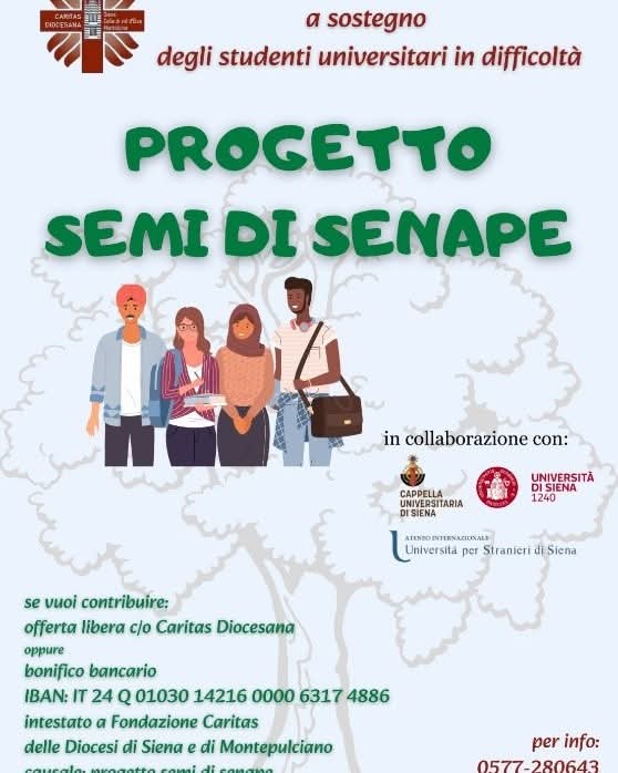 SIENA. Il progetto “Semi di senape”, promosso da Caritas Diocesana di Siena in collaborazione con la Pastorale Universitaria, l’Università degli Studi di Siena e l’Università per Stranieri di Siena nasce dall’idea di aiutare ed accompagnare, durante il loro percorso di studi, gli studenti universitari non assegnatari di borse di studio o che si trovano in difficoltà economiche, che sempre più spesso si presentano al nostro centro d’ascolto.