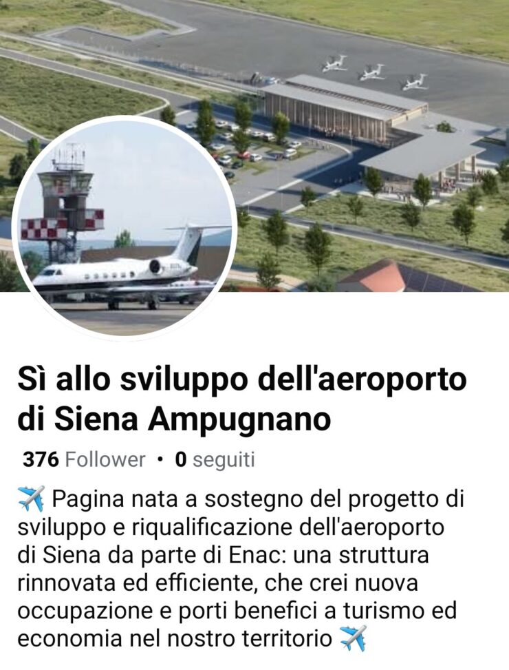“Questa pagina non rappresenta un “comitato del Sì”, come riportato da qualche articolo uscito stamani, ma è stata creata al solo scopo di seguire le vicende dell’aeroporto di Siena Ampugnano e tramite i followers raccolti dimostrare che non esistono solo cittadini contrari al progetto”.