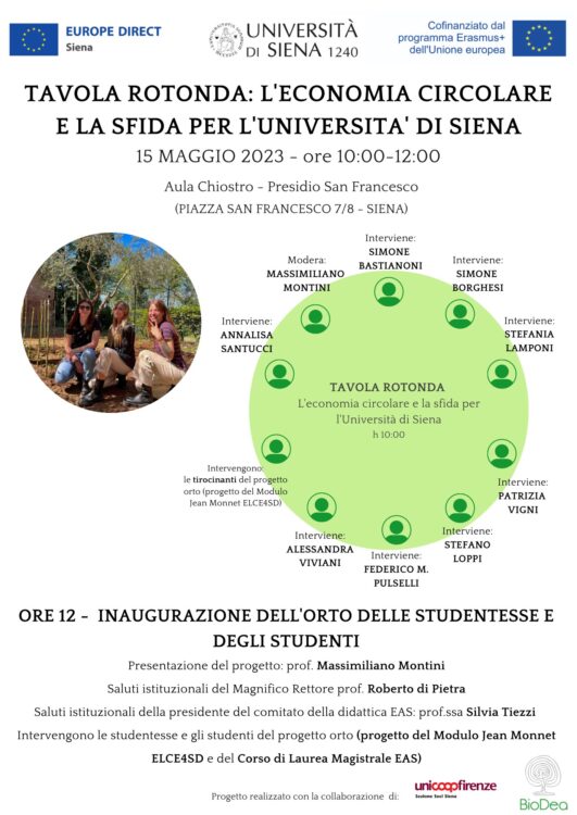 L’evento, in programma per le ore 12 circa, sarà preceduto alle ore 10 nell’aula Chiostro, dalla tavola rotonda “L’economia circolare e la sfida per l’Università di Siena”, a seguire si terrà un momento conviviale nell’orto.