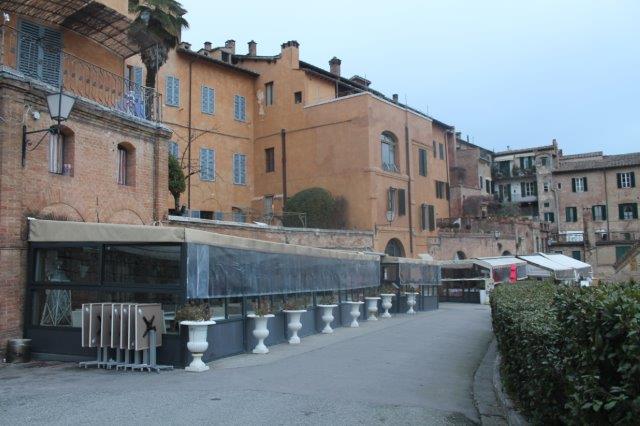 Certo, Siena è una citta turistica e accoglie frotte di persone, che forse sono abituate, o non possono fare a meno di gustarsi un trancio di pizza seduti dentro una struttura di ferro e plasticone trasparente, riscaldate con grandi stufe per permettere ai clienti di stare fuori anche d’inverno e godersi il panorama.