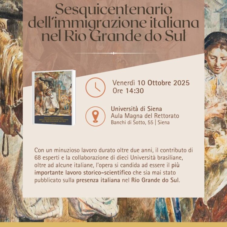 L’incontro, aperto a tutti gli interessati, si terrà alle ore 14.30 nell’Aula Magna del palazzo del Rettorato (Banchi di Sotto, 55) a Siena, e vedrà presentata l’opera bilingue, italiano e portoghese, “Centocinquantenario dell’immigrazione italiana nel Rio Grande do Sul 1875-2025”.