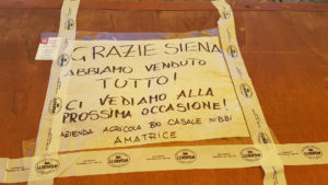 Con questo cartello una delle aziende di Amatrice ha salutato già dalla mattina di domenica 2 giugno “Siena per”, la manifestazione ideata dall’amministrazione comunale nella volontà di offrire un aiuto concreto a chi si è trovato vittima di catastrofi naturali e che ancora fa fatica a ripartire.