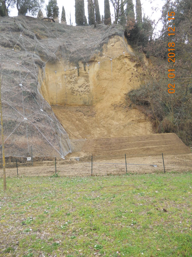 L’intervento, totalmente in area comunale, si è concretizzato nel taglio della vegetazione, messa in opera di reti metalliche armate su un’area di circa 2500 m2, creazione di un terrapieno di tre metri di altezza rinforzato con geogriglia, e regimazione delle acque alla base del versante.
