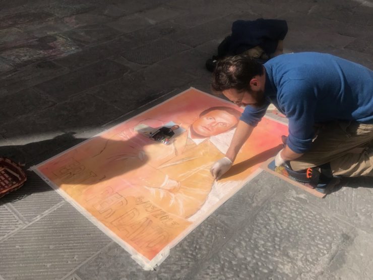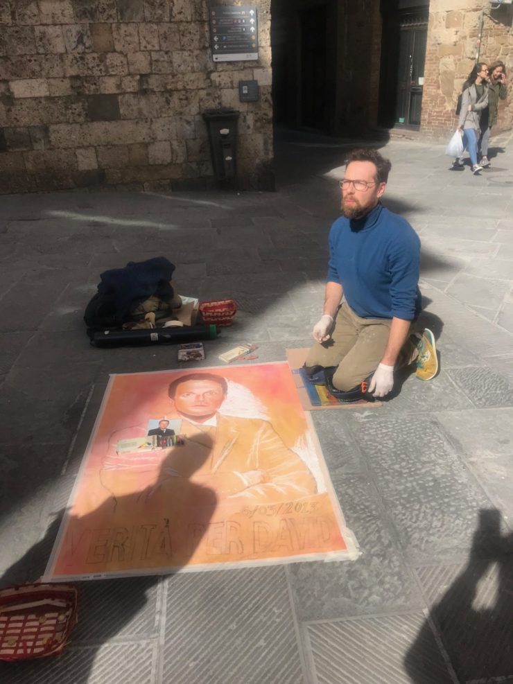 SIENA. (a. m.) Una particolare commemorazione della morte di David Rossi (avvenuta il 6 marzo 2013) è in via di realizzazione da parte di un “madonnaro”, che nei pressi del Monte dei Paschi sta disegnando un ritratto dell’ex manager Mps. Per una volta il ritratto è stato realizzato su una tela, che verrà donata alla madre di David Rossi.