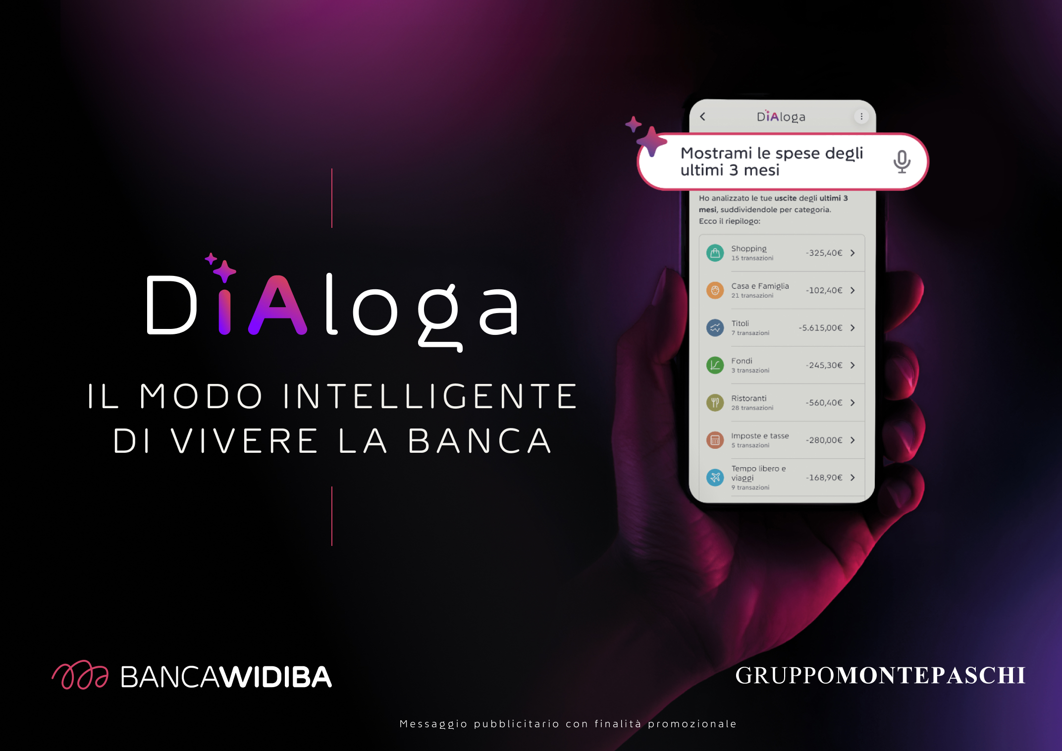 Con l’App DiAloga, Banca Widiba introduce una nuova modalità di interazione tra cliente e banca: grazie a un’interfaccia evoluta, sarà possibile svolgere le principali operazioni bancarie – come bonifici, analisi delle spese, analisi patrimoniale – semplicemente dialogando con l’App, sia tramite testo, sia tramite voce. Un’innovazione che fa di Banca Widiba, Gruppo Montepaschi, la prima realtà italiana a offrire ai propri clienti la possibilità di trasformare l’esperienza di home banking in un servizio ancora più diretto, accessibile e personalizzato.