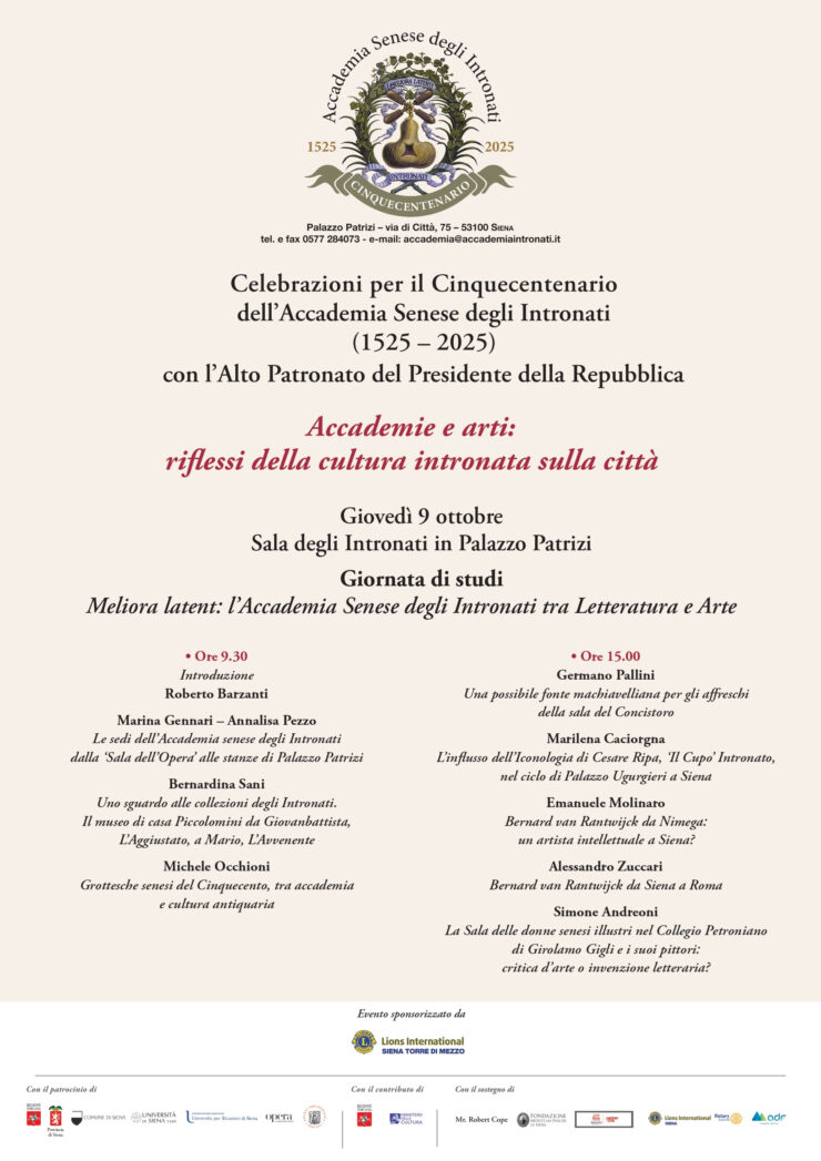 SIENA. Continuano, il 9 ottobre, le celebrazioni per il Cinquecentenario dell’Accademia Senese degli Intronati (1525-2025), con l’Alto Patronato del Presidente della Repubblica, contraddistinte da un ricco e variegato programma che riflette il raffinato carattere interdisciplinare della stessa Accademia a partire dalla sua fondazione. La giornata di studi Meliora latent, un evento sponsorizzato da Lions International Siena – Torre di Mezzo, e con il patrocinio, contributo e sostegno di numerosi enti, intende esaminare un campo che resta spesso insondato, quello del rapporto tra la letteratura e arte, committenza e cicli pittorici, progetto ed esecuzione. Spesso, nelle ricerche, si tralascia l’indagine relativa al ruolo degli ideatori del programma, di coloro che hanno suggerito tematiche, emblemi, soggetti consoni a illustrare lo scopo primo dell’opera d’arte. Partecipano al convegno studiosi dell’Università degli Studi di Siena e della Sapienza di Roma, oltreché di altre istituzioni senesi. L’apertura dei lavori, alle 9.30, si deve all’Archintronato Roberto Barzanti; seguono gli interventi di Marina Gennari e Annalisa Pezzo che getteranno luce sui “luoghi” dell’Accademia: Le sedi dell’Accademia senese degli Intronati dalla ‘Sala dell’Opera’ alle stanze di Palazzo Patrizi; parteciperanno dunque Bernardina Sani (Uno sguardo alle collezioni degli Intronati. Il museo di casa Piccolomini da Giovanbattista L’Aggiustato a Mario L’Avvenente), Michele Occhioni (Grottesche senesi del Cinquecento, tra accademia e cultura antiquaria), Germano Pallini (Una possibile fonte machiavelliana per gli affreschi della sala del Concistoro), Marilena Caciorgna (L’influsso dell’Iconologia di Cesare Ripa, Accademico Intronato detto ‘Il Cupo’, nel ciclo di Palazzo Ugurgieri a Siena), Emanuele Molinaro, Bernard Van Rantwijck da Nimega: Un’artista intellettuale a Siena?, Alessandro Zuccari, Bernard van Rantwijck da Siena a Roma; conclude Simone Andreoni con il contributo: La Sala delle donne senesi illustri nel Collegio Petroniano di Girolamo Gigli e i suoi pittori: critica d’arte o invenzione letteraria?