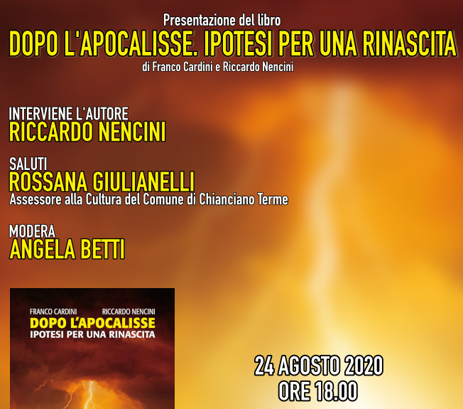 CHIANCIANO TERME. A Chianciano Terme, nell’estate dedicata a Federico Fellini, nel Parco Termale Acqua Santa (Piazza Martiri Perugini) in calendario, tra gli altri, anche la presentazione di un libro di grande attualità. In sala Fellini lunedì 24 agosto 2020 alle ore 18.00, Riccardo Nencini, neo Presidente della Commissione Cultura del Senato, presenta il libro dedicato al post Covid ‘Dopo l’apocalisse. Ipotesi per una rinascita’, scritto a quattro mani insieme allo storico Franco Cardini, un libro che racconta le epidemie del passato e spalanca una finestra sul futuro. È un viaggio nella storia – dalla peste che decimò l’Atene di Pericle al dramma narrato dal Manzoni – da cui trarre indicazioni utili a comprendere cosa potrebbe accadere nei prossimi mesi in Italia e nelle relazioni internazionali. Uno sguardo attento ed ironico nel racconto dell’oggi rapportato a ieri. Nonostante ci separino quattro secoli dalla peste che infierì sulla Lombardia e su Venezia, ci si imbatte negli stessi errori e nelle stesse contromisure, comprese le autocertificazioni. E poi le titubanze della scienza, le pressioni dei mercanti (oggi, le imprese), le dicerie e le false notizie propagate per fini politici. Sarà presente il Vicesindaco e Assessore alla Cultura del Comune di Chianciano Terme, Rossana Giulianelli. Modera: Angela Betti.
