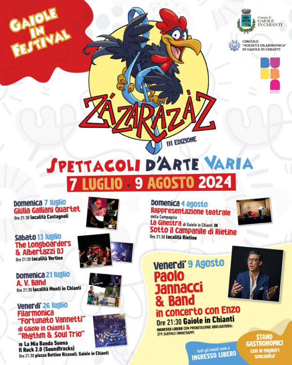 “ZÁZARAZÀZ è un festival itinerante – spiega Emanuele Giunti, assessore alla Cultura di Gaiole in Chianti – che attraverso la musica e il teatro valorizza alcuni dei luoghi più suggestivi del nostro territorio. Un format di successo che anno dopo anno è possibile riproporre grazie all’impegno organizzativo della nostra Filarmonica, che ringraziamo. Quest’anno chiuderemo il Festival in bellezza, il 9 agosto, con Paolo Jannacci & band in concerto, una serata in cui gli artisti sul palco omaggiano Enzo Iannacci ripercorrendo la sua straordinaria carriera. Tutti gli eventi sono a ingresso libero ma per la serata di Paolo Iannacci è obbligatoria la prenotazione.”