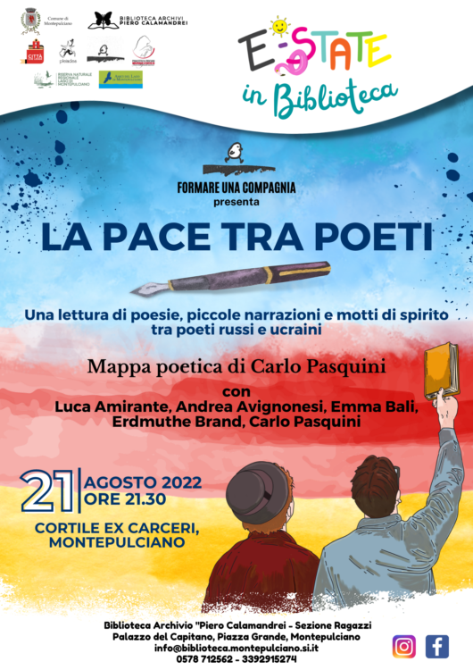 MONTEPULCIANO. Nell’ambito di “E-State in Biblioteca”, il ricco cartellone di attività proposto per i mesi di luglio, agosto e settembre 2022 dalla Biblioteca Archivio Storico “Piero Calamandrei” di Montepulciano, si replica, domenica 21 agosto, alle 21.30, “La pace tra poeti” (ingresso libero).