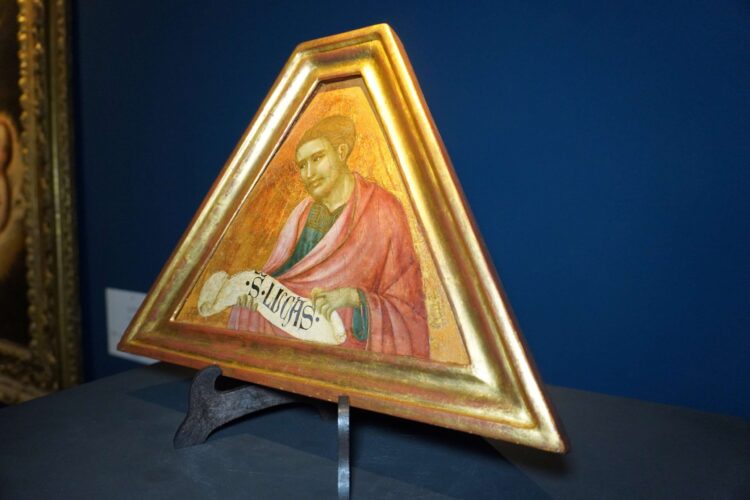 Il dipinto, una piccola tavola triangolare a fondo oro raffigurante l’Evangelista Luca a mezzo busto, è stato identificato come una delle cuspidi del Polittico di Monticchiello, realizzato dal giovane Pietro Lorenzetti (Siena, documentato dal 1306 al 1345) nel secondo decennio del Trecento per la Chiesa di San Leonardo a Monticchiello; dell’opera, che la preziosità degna di una miniatura, si erano perse le tracce per circa novanta anni. Smembrata nel corso dei secoli, l’antica pala d’altare vede ora il ritorno di un suo tassello fondamentale, accanto alla “Madonna col Bambino”, già conservata nel Museo Diocesano di Palazzo Borgia a Pienza.