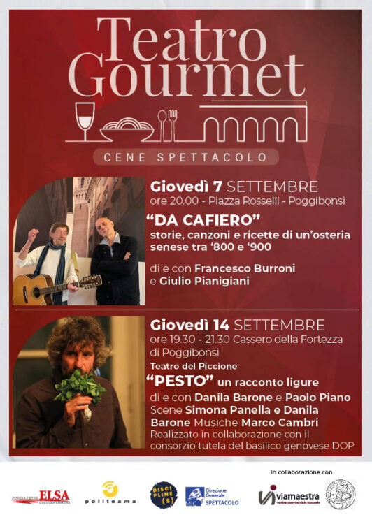POGGIBONSI. A Poggibonsi in arrivo due serate di “Teatro Gourmet”, che uniscono il cibo e il teatro di qualità organizzate da Fondazione Elsa- Teatro Politeama in collaborazione con la taverna fantasy Passaporta e con Centro Commerciale Naturale Ass. Via Maestra. Primo appuntamento giovedì 7 settembre alle 20.00 nel centro storico di Poggibonsi, in Piazza Rosselli, con “Cafiero” storie, canzoni e ricette di un’osteria senese tra ‘800 e ‘900 di e con Francesco Burroni e Giulio Pianigiani. Una cena spettacolo dedicata alla cultura, alla cucina e alla tradizione senese e toscana. Lo spettacolo parte dalla tesi di laurea imperniata sulla ricerca diretta dal vivo condotta da Francesco Burroni verso la fine degli anni ’70 all’Università degli studi di Siena con il prof. Pietro Clemente e la consulenza del prof. Alessandro Falassi. Dal vinaio senese Cafiero vennero raccolti centinaia di canti e melodie spesso molto diversi dal repertorio della tradizione popolare toscana oggi conosciuto che si è invece prevalentemente formato sulla diffusione che ne è stata fatta a partire degli anni ’70 con il fenomeno del folk revival. Lo spettacolo propone i canti alternandoli a racconti, aneddoti, ricette che ci danno un quadro insieme aspro, poetico e ironico della cultura popolare toscana che aveva nello spazio e nell’ambiente umano dell’osteria una delle sue maggiori espressioni. Durante lo spettacolo verrà servita una cena a tema. Il menù prevede vari piatti della tradizione senese e toscana accompagnati da vino delle aziende vinicole locali. Si parte con l’antipasto a base di acciughe sotto pesto fatte in casa, soppressata a fette, pecorino senese, uovo sodo come da tradizione, a seguire “Panzanella”, Baccalà alla Livornese e “Buglioncino” di verdure; per dolce la crostata di marmellata. La serata è su prenotazione (cena e spettacolo €. 40,00). Per prenotazioni, entro il 4 settembre, info@passaporta.it; FB Passaporta Fantasy Food & Drinks.