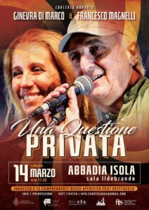 MONTERIGGIONI.  Sabato 14 marzo alle ore 17.30 la Sala Ildebrando del Complesso monumentale di Abbadia Isola ospita “Una questione privata”, appuntamento musicale con Ginevra Di Marco e Francesco Magnelli che si presenta come un vero e proprio viaggio tra parole, suoni e memoria artistica.