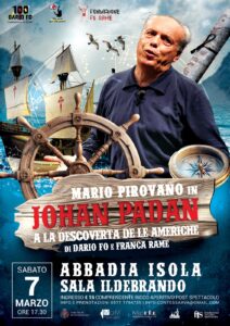 MONTERIGGIONI. Sabato 7 marzo, alle ore 17.30, nella suggestiva cornice del complesso monumentale di Abbadia Isola (Sala Ildebrando), arriva la Compagnia Teatrale Fo Rame con “Johan Padan a la descovèrta de le Americhe” di Dario Fo e Franca Rame, portato in scena da Mario Pirovano.