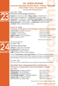 CHIANCIANO TERME. Ventiquattro anni di proiezioni con i migliori corti in circolazione, opere a volte a basso budget e in molti casi invece prodotte da case cinematografiche. Venerdì 23 e sabato 24 agosto, a Chianciano Terme (Siena), torna l’appuntamento con ‘Corto Fiction, l’Italia migliore’ con 210 cortometraggi selezionati e che, seppur nelle difficolta delle storie, portano alla luce il sentimento della speranza.
