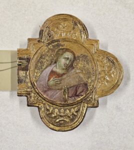 Le tavolette lignee a tempera oro dell’artista trecentesco, verosimilmente commissionate dall’ospedale senese, in origine erano due capi croce. Segate dal manufatto di cui facevano parte furono assemblate per svolgere la funzione di semplici immagini devozionali. Per la loro forma polilobata e le dimensioni ridotte (rispettivamente 18,3×16,7 cm e 18,4×16,5 cm), rimandano ai crocifissi in metallo dorato realizzati nelle botteghe orafe senesi fra la fine del Duecento e il Trecento.