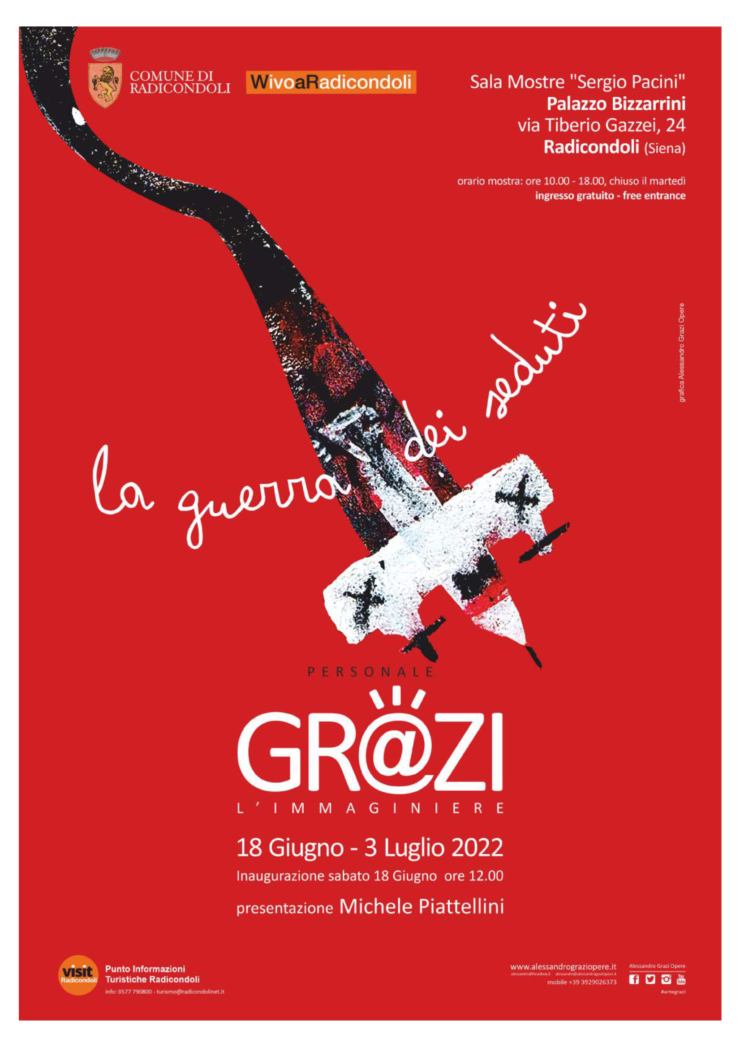 RADICONDOLI. “La guerra dei seduti” è il titolo della personale di Alessandro Grazi ripreso dalla grande opera presentata proprio a Radicondoli. L’artista scrive sulla sua pagina social: “Ormai molte decisioni a tutti i livelli, dal condominio ad una nazione, vengono prese a tavolino. Su di una sedia, magari rossa come quella sagoma disegnata in mezzo, e senza consultare nessuno. Chiusi nella ideale “stanza dei bottoni” dove non ci si confronta con nessuno e su niente. Si va in “guerra” senza partire, senza alzare un dito ma premendo un potente tasto che può inviare una parola, un messaggio, un aereo o un razzo. Forse chi si siede ha un cu…ore ma troppo vicino alle mele”.