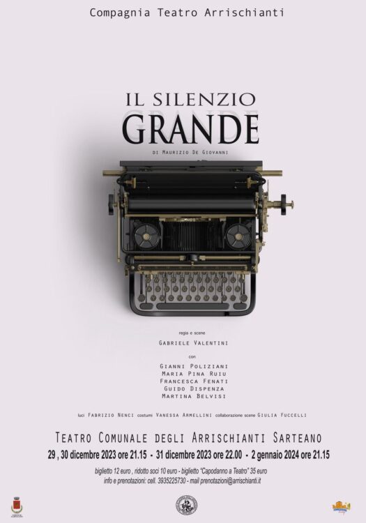 gianni-poliziani-attore SARTEANO. Torna, come ormai da tradizione, il Capodanno al Teatro Arrischianti di Sarteano e questa volta, in attesa dello scoccare della mezzanotte, la Compagnia Teatro Arrischianti porta in scena “Il silenzio grande” di Maurizio de Giovanni per la regia di Gabriele Valentini, che firma anche le scene, le luci sono di Fabrizio Nenci ed i costumi di Vanessa Armellini. Il debutto è fissato per il 29 dicembre ore 21.15 al Teatro Comunale degli Arrischianti, per proseguire in replica il 30, il 31 – quest’ultima con inizio alle 22.00 e buffet di mezzanotte – e il 2 gennaio 2024 ore 21,15.