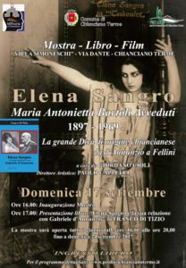 Domenica 17 Settembre – ore 16.00 – Inaugurazione Mostra Elena Sangro. Ore 17.00, Franco Di Tizio presenterà il libro “Elena Sangro e la sua relazione con Gabriele d’Annunzio”. Franca Minnucci, attrice scrittrice, leggerà alcuni brani del libro. Intervento dell’Editore Mario Ianieri. Presenta la serata Valentina Innocenti esperta in cinema.