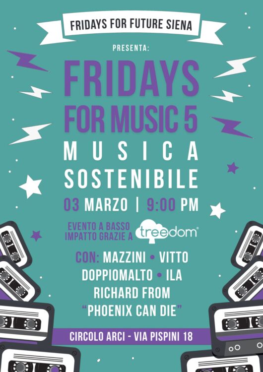 FRIDAYS FOR MUSIC è un evento organizzato da Fridays for Future Siena che avrà luogo al Circolo Arci (Via Pispini 18).