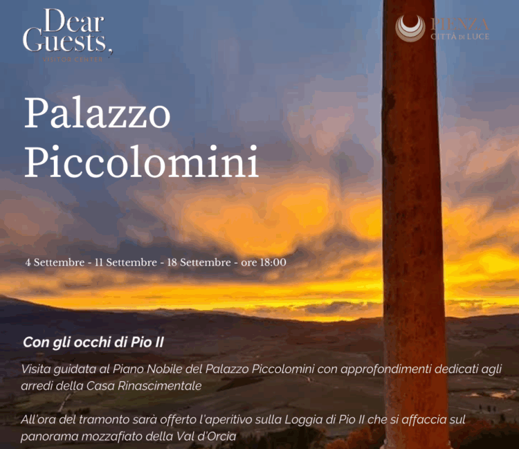 PIENZA. Opera Laboratori, in collaborazione con la Società di Esecutori di Pie Disposizioni, propone tre appuntamenti speciali nel mese di settembre. Un’occasione unica per scoprire Palazzo Piccolomini e vivere l’esperienza del tramonto sulla Val d’Orcia, patrimonio mondiale Unesco.