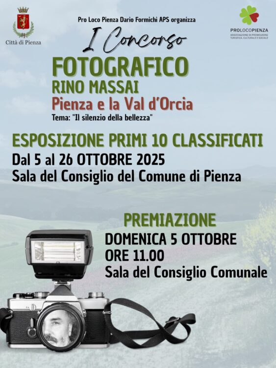 PIENZA. Quarantadue partecipanti e centododici foto. Questi sono i numeri della prima edizione del Concorso Fotografico “Rino Massai”, dal titolo “Pienza e la Val d’Orcia”, organizzato dalla Pro Loco Pienza e patrocinato dal Comune, che domenica 5 ottobre alle 11:00, nella Sala del Consiglio Comunale, presenterà le prime dieci arrivate, votate da una giuria composta da fotografi professionisti e organizzatori, i cui componenti saranno resi noti proprio domenica.