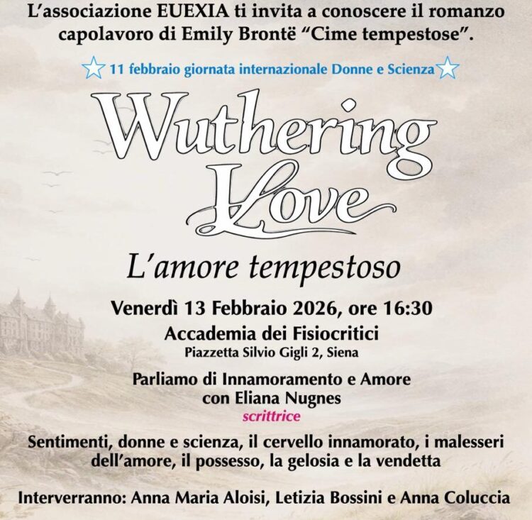 L’evento, dal titolo “Wuthering Love. L’amore tempestoso”, si terrà venerdì 13 febbraio 2026 alle ore 16:30 presso l’Accademia dei Fisiocritici, in Piazzetta Silvio Gigli 2 di Siena, e si svolge con il patrocinio dell’Accademia, dell’Università di Siena e di Mulinum “il primo mulino dei contadini”.