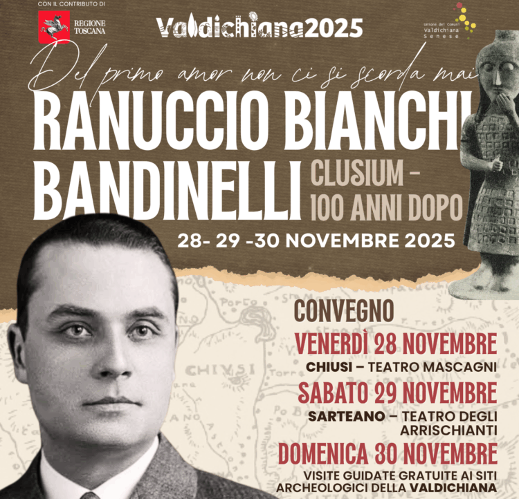 Nel centenario della pubblicazione di “Clusium. Ricerche archeologiche e topografiche su Chiusi e il suo territorio in età etrusca” (1925), l’Unione dei Comuni della Valdichiana Senese presenta un ampio progetto dedicato a Ranuccio Bianchi Bandinelli, tra i maggiori archeologi e storici dell’arte italiani del Novecento, con tre giornate di studi, incontri e attività pubbliche che si svolgeranno tra Chiusi, Sarteano e le principali aree archeologiche della Valdichiana Senese, nell’ambito del calendario ufficiale di Valdichiana2025 Capitale Toscana della Cultura.