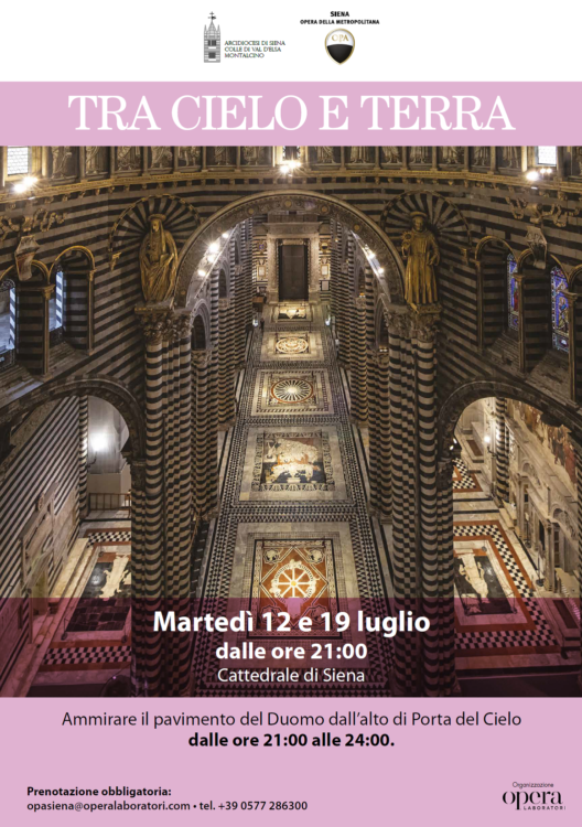 Tra Cielo e Terra è, inoltre, il doppio appuntamento per gli altri due martedì di luglio, il 12 ed il 19, dalle ore 21 alle ore 24, quando il pavimento del Duomo torna protagonista con la possibilità di ammirarlo dall’alto di Porta del Cielo.