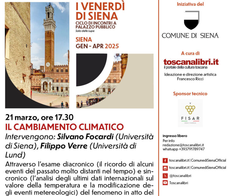 SIENA. Nuovo appuntamento con I Venerdì di Siena il 21 marzo alle 17.30 nella Sala delle Lupe di Palazzo Pubblico, questa volta dedicato al cambiamento climatico. Ad intervenire Silvano Focardi dell’Università di Siena e Filippo Verre dell’Università di Lund.