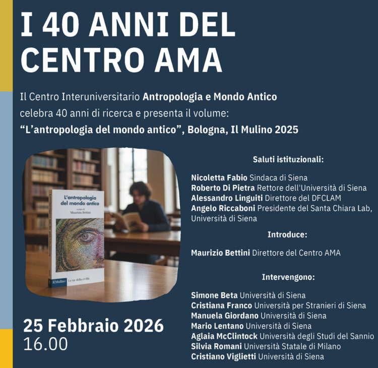 SIENA. Il Centro Interuniversitario Antropologia e Mondo Antico – AMA celebra quarant’anni di attività con la presentazione del volume “L’antropologia del mondo antico”, in programma il 25 febbraio alle ore 16 presso l’Auditorium del Santa Chiara Lab (via Valdimontone 1) a Siena.
