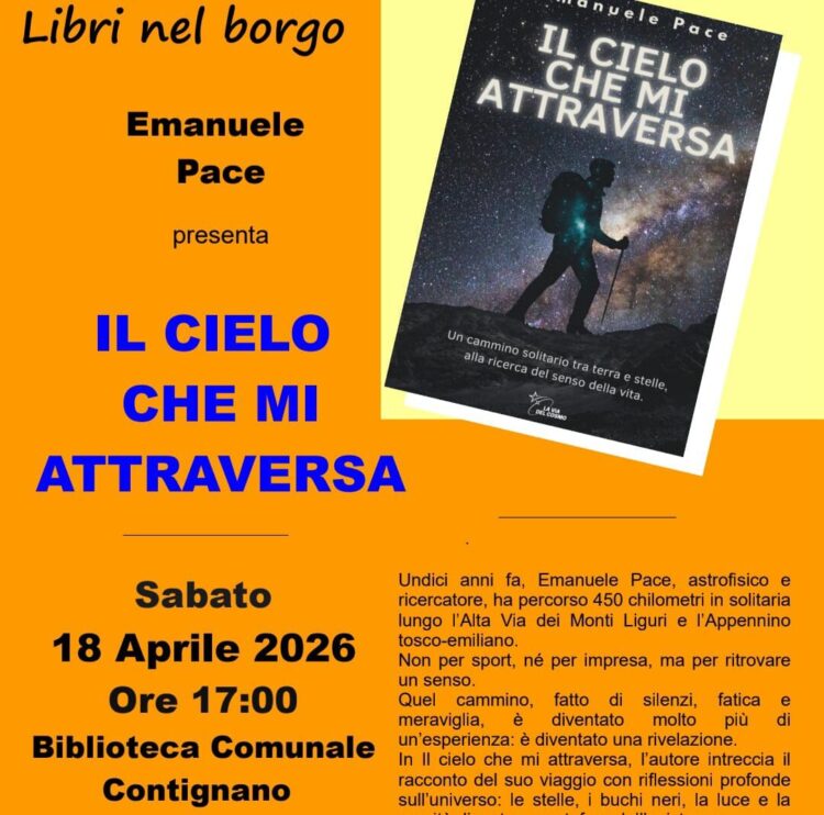 CONTIGNANO (RADICOFANI, VAL D’ORCIA) – Continua la presentazione di libri alla Biblioteca comunale di Radicofani, nella frazione di Contignano, con Il cielo che mi attraversa, di Emanuele Pace. L’appuntamento con l’autore è per sabato 18 aprile (ore 17). L’ingresso è libero. Al termine verrà offerto, come di consueto, un piccolo rinfresco. Emanuele Pace, astrofisico e divulgatore con una passione autentica per il cielo e il viaggio interiore, nel suo libro compie cammino verso il senso della vita, raccontato con semplicità e poesia. Il cielo che mi attraversa è un’opera che unisce scienza, riflessione e narrazione personale. L’autore racconta un lungo viaggio a piedi, fatto di pause, notti sotto le stelle e contemplazione della natura, in cui riflette sul cosmo e su noi stessi. Il cielo non è solo un oggetto di studio: diventa compagno di viaggio, metafora del nostro cammino e chiave di lettura per ritrovare equilibrio e meraviglia nel quotidiano. Vengono spiegati concetti astronomici con parole semplici e accessibili e si invita a una riflessione profonda sul senso della vita e sul nostro rapporto con l’universo. Sono i contenuti ideali per chi ama la natura, il cielo stellato e le letture che ispirano. Tra l’altro a Radicofani si trova un osservatorio astronomico, in un territorio costellato da itinerari celebri, la Francigena ed altre strade da percorrere con lentezza. Quale migliore contesto per presentare il libro di Emanuele Pace?