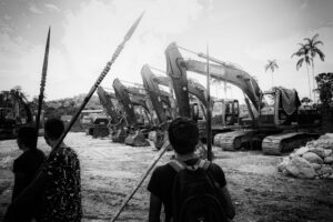 - 14/11/2018 Kichwa Santa Clara community, Pastaza Province in Ecuador. Young Kichwa men stand guard near the caterpillars set to excavate the forest for the construction of Genefran’s hydro-power plant over Piatúa River. The project did not offer prior, free and informed consultation to the Santa Clara community as it should have according to law. Genefran’s preliminary construction work was halted by Indigenous protesters in defense of the river Piatúa, the community’s main water source. The Piatúa, a tributary of the Amazon located in the Pastaza region of Ecuador, is thought to be millions of years old, home to one of the most biodiverse areas of the world, where flora and fauna is yet to be know. For the Kichwa Indigenous people of Pastaza, the Piatúa river is sacred: it is a living being, revered and feared, loved and protected.