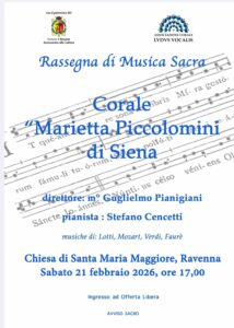 La Corale Marietta Piccolomini è stata invitata dall’associazione musicale Ludus Vocalis  ad aprire la loro tradizionale Rassegna Corale di Musica Sacra che si terrà a Ravenna, giunta già alla XVIII edizione, Sabato 21 febbraio alle ore 17, nella Chiesa di Santa Maria Maggiore col patrocinio dell’Assessorato alla Cultura del Comune di Ravenna.