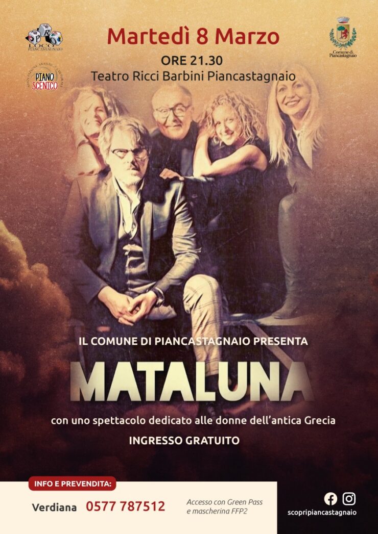 PIANCASTAGNAIO. I Mataluna presentano al teatro Vittorino Ricci Barbini di Piancastagnaio (ore 21,30, ingresso gratuito), in occasione dell’8 marzo, letture e dedicata alle donne dell’antica Grecia, con le descrizioni della professoressa Mariangela Galatea Vaglio. Si conoscerà Didone e non solo: arriveranno anche Aspasia e Penelope e tante altre donne famose. Le letture saranno accompagnate ed intervallate dalla musica, che spazia dal genere pop al jazz passando per il blues. «Un modo originale per festeggiare questa ricorrenza – è la posizione degli assessori comunali Elisabetta Bensi e Roberta Sancasciani – un omaggio del Comune a tutte le donne, reso possibile dalla collaborazione con la Proloco e con l’associazione Piano Scenico».