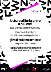 SIENA. Un nuovo appuntamento a Siena per gli amanti della poesia e della cultura targato VIS-À-VIS parole: giovedì 19 dicembre alle ore 18, il Tepidarium dell’Orto Botanico del Sistema museale universitario senese accoglierà una speciale lettura serale dedicata alla poesia contemporanea, “Letture all’imbrunire a più voci”. L’evento vedrà protagoniste le opere selezionate da un collettivo di poeti dell’Università di Siena: Ilaria Crocchini (Siena, classe 1999), Andrea Ragazzo (Padova, classe 2000) e Beatrice Restelli (Milano, classe 2000).