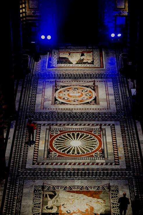 SIENA. Ecco le immagini della nuova illuminazione delle tarsie marmoree del Pavimento del Duomo di Siena. Nella fotogallery anche alcune immagini dell’evento, creato da Marco Nereo Rotelli, di ieri sera, che ha interessato la facciata del Duomo e la piazza circostante in occasione dell’inaugurazione del nuovo percorso luminoso.