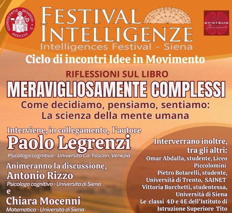 A partire dai temi che si intrecciano nel volume, Legrenzi dialogherà con Chiara Mocenni, matematica dell’Università di Siena ed esperta di modelli e sistemi complessi, e con Antonio Rizzo, psicologo cognitivo dello stesso Ateneo e studioso dei processi cognitivi e del comportamento umano, in un confronto interattivo con studenti e docenti delle scuole medie superiori, studenti universitari e pubblico.