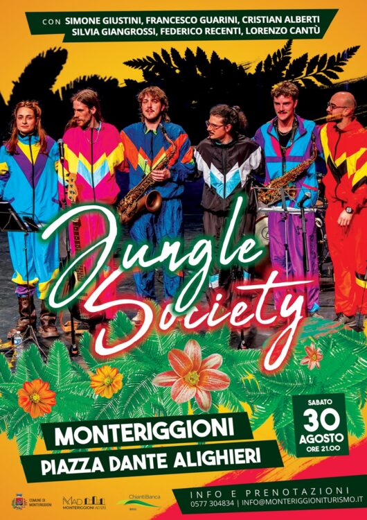 Sabato 30 agosto, ore 21.00, Castello di Monteriggioni, Piazza Dante Alighieri, “Jungle Society in Concerto”. La formazione composta da Simone Giustini, Francesco Guarini, Cristian Alberti, Silvia Giangrossi, Federico Recenti e Lorenzo Cantù chiude la rassegna con un concerto che mescola groove contemporanei, influenze jazz-funk e una forte energia collettiva. La Jungle Society è un progetto musicale giovane e vitale, capace di fondere sonorità urbane e tradizioni, regalando al pubblico un live travolgente e partecipativo.
