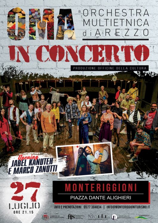 Sabato 27 luglio, ore 21:15, ancora al Castello di Monteriggioni in Piazza Dante Alighieri, il travolgente concerto dell’OMA (Orchestra Multietnica di Arezzo). Diretta da Enrico Fink in collaborazione con Massimiliano Dragoni, l’OMA nasce nel 2007 da un percorso formativo, aperto alla partecipazione di musicisti italiani e stranieri e finalizzato alla conoscenza e all’approfondimento delle strutture di base delle musiche tradizionali delle aree del mediterraneo, per incrociarle con la tradizione italiana ed europea e predisporre un repertorio basato sulla contaminazione. L’attuale formazione dell’OMA è costituita da circa 35 musicisti provenienti da Albania, Palestina, Libano, Nigeria, Costa d’Avorio, Argentina, Colombia, Bangladesh, Giappone, Romania, Russia, Svizzera e dalle più svariate regioni italiane.