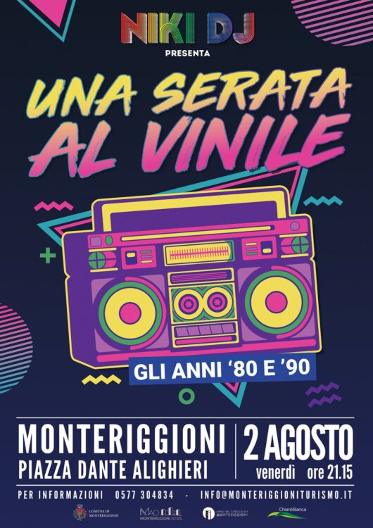Venerdì 2 agosto, ore 21:15, al Castello di Monteriggioni in Piazza Dante Alighieri, prosegue il viaggio nella musica dei vinili, iniziato la settimana scorsa, arrivando e ricreando le atmosfere degli anni ’80 e ’90 con Niki DJ; le persone, come hanno già fatto nella settimana appena conclusasi, potranno ballare e divertirsi all’interno di una quinta scenica unica come il castello.
