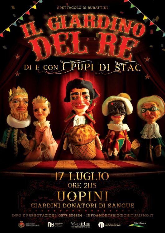 Mercoledì 17 luglio alle ore 21,15, l’appuntamento si sposta a Uopini presso il Giardino dei Donatori di Sangue, con uno spettacolo per famiglie: “Il Giardino del Re” di e con i Pupi di Stac. La durata è di circa 60 minuti, in due atti, recitato e cantato dal vivo, con musiche di scena registrate. I pupi, di legno intagliato, sono alti circa 60 centimetri e hanno, unici nella tradizione italiana, figura intera: sono, insomma, “marionette senza fili” animate dal basso o, se si preferisce, “burattini con le gambe” come il loro fratello più famoso: Pinocchio.