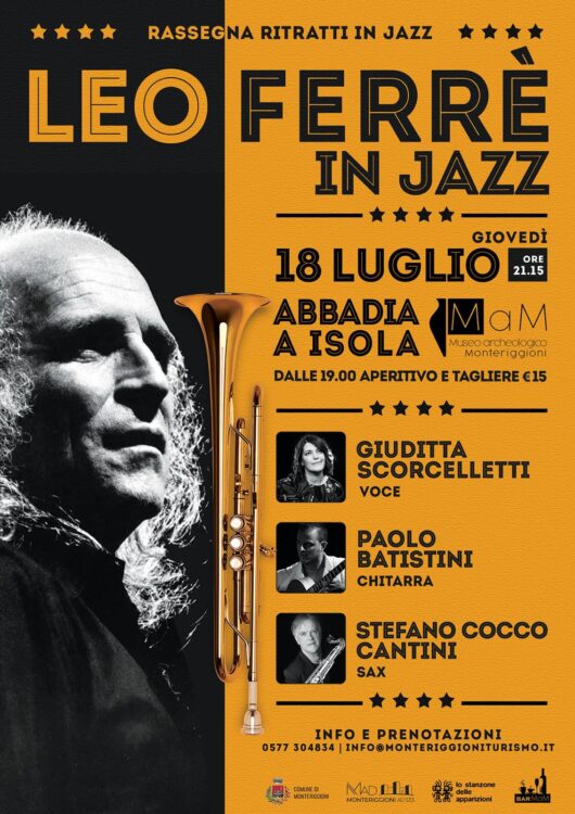 Giovedì 18 luglio si torna, invece, nel chiostro di Abbadia Isola; qui a partire dalle ore 21, avrà luogo il secondo appuntamento di “Ritratti in Jazz”, rassegna curata da Stefano Cocco Cantini, con la collaborazione di Ares Tavolazzi e dello Stanzone delle apparizioni; questa volta verrà trattata e rivisitata la musica di Leo Ferré: “Leo Ferré in Jazz” è infatti il titolo della serata in cui si esibiranno Giuditta Scorcelletti voce, Paolo Batistini chitarra, Stefano Cocco Cantini sax. A partire dalle 19, prenotando, sarà possibile prendere un aperitivo e un tagliere presso il BarMaM, il bar legato al Museo Archeologico di Monteriggioni che peraltro potrà essere visitato dopo lo spettacolo con la guida del suo direttore Giacomo Baldini.