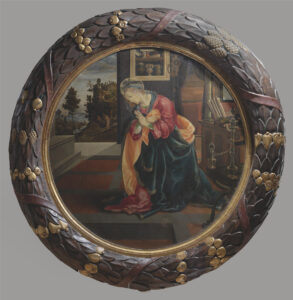 I due dipinti furono commissionati nel 1482 dai Priori e dai Capitani della fazione guelfa per ornare la Sala dell’Udienza all’interno del Palazzo comunale, oggi anche sede della Pinacoteca. Quell’anno Filippino Lippi concepì i due tondi distinti raffiguranti l’Annunciazione, mentre le cornici con decorazione a intaglio di foglie di quercia e alloro con ghiande e bacche furono realizzate intorno al 1490 da Antonio da Colle, un artigiano a cui si attribuiscono anche il pulpito e il coro ligneo della Collegiata di San Gimignano.