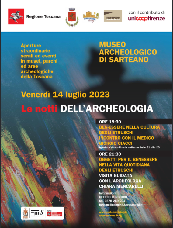Giunta alla ventitreesima edizione, la rassegna Le Notti dell’Archeologia (grande cartellone regionale, che copre l’intero mese di luglio di ogni anno) costituisce una preziosa occasione per visite e approfondimenti nei musei e nelle aree archeologiche della Toscana. Il tema del 2023 offre lo spunto per un confronto tra passato e presente che riguarda abitudini e stili di vita, attenzioni al corpo e allo spirito, tenendo conto della diversità tra i livelli sociali nelle varie epoche. Per informazioni: Ufficio turistico, tel. 0578 269 204, turismo@comune.sarteano.it.
